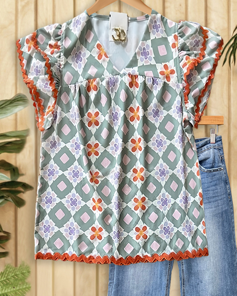Mint Boutique Geometric Print Retro Tiered Sleeve Ricrac Trim T-Shirt