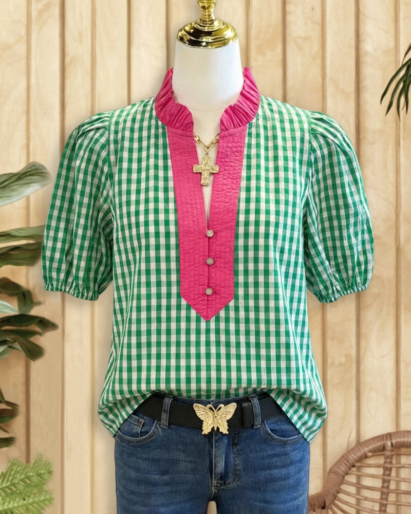 Mint Boutique Gingham Chic Puff Sleeve V Neck Blouse
