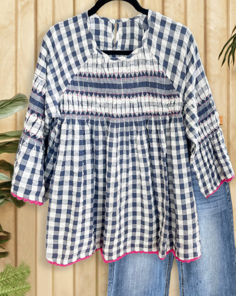 Mint Boutique Gingham Cute Bell Sleeve Scalloped Trim Blouse