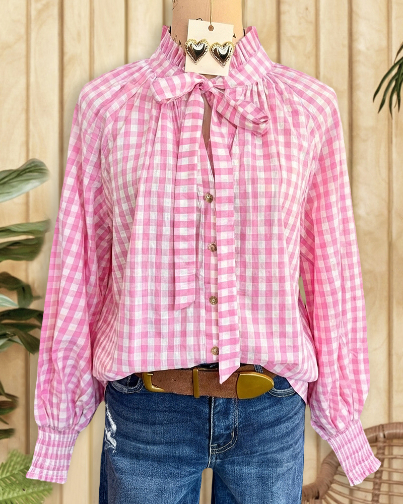 Elegant gingham blouse with pussy bow, perfect for work, dates, and polished everyday style.