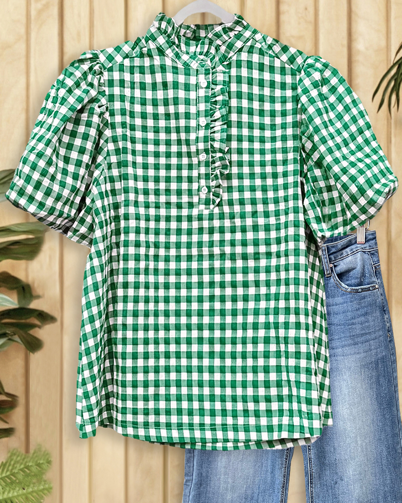 Feminine gingham blouse with puff sleeves and buttons, perfect for casual charm.