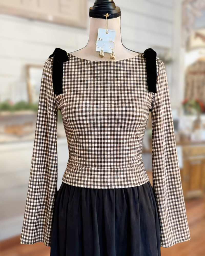 Feminine gingham blouse with tie shoulders and bell sleeves, perfect for casual chic wear.