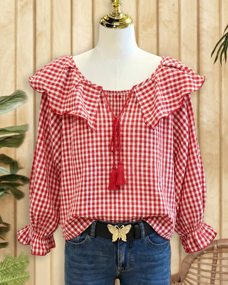 Perfect for casual or playful looks, featuring gingham print, ruffle details, and a tie-neck design.
