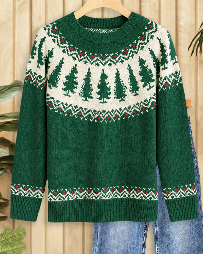 Casual round-neck sweater with Christmas tree design, perfect for festive days.