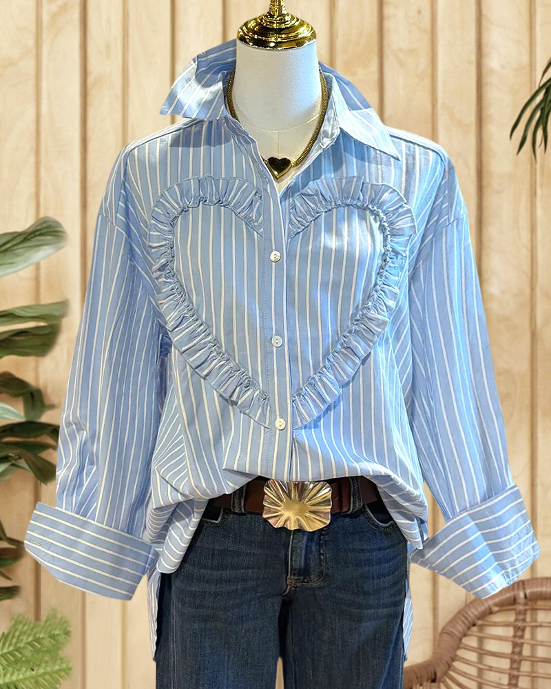 Rocking button-up shirt with heart applique and stripes, perfect for casual or trendy outfits.