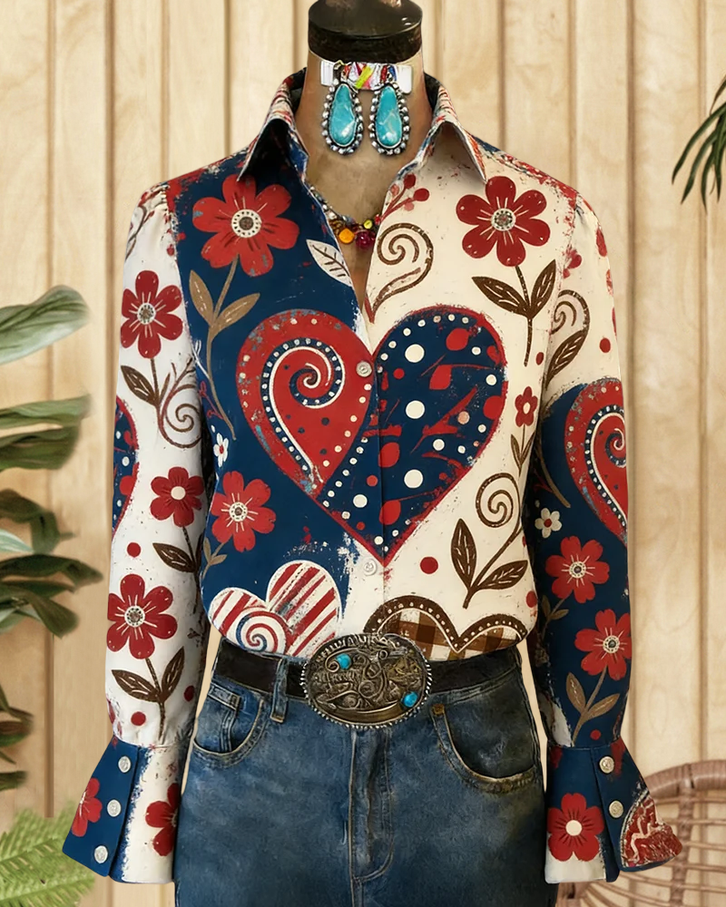 Retro button-up blouse with heart and floral print and trumpet sleeves, perfect for vintage-inspired daily wear.