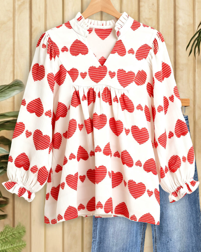 Pretty V-neck blouse with heart pattern and puff sleeves, perfect for charming casual wear.