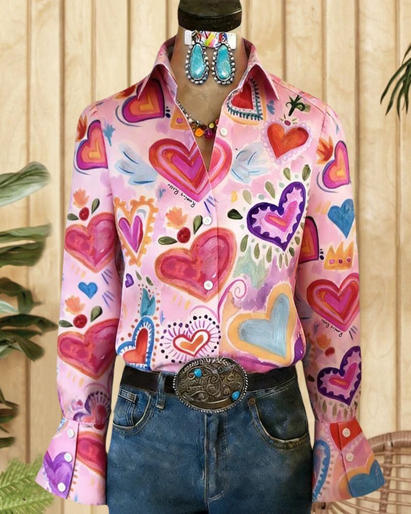 Pretty button-up blouse with heart print and trumpet sleeves, perfect for feminine daily wear.