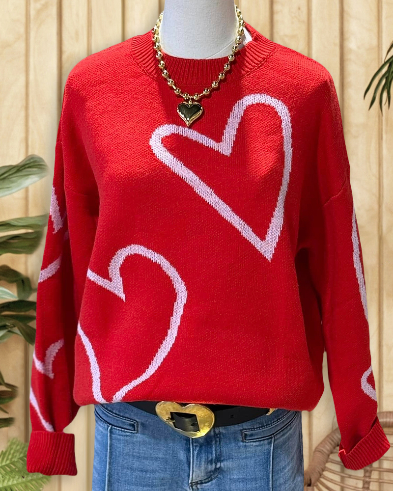 Romantic heart-patterned sweater with round neck and drop shoulders, perfect for cozy days.