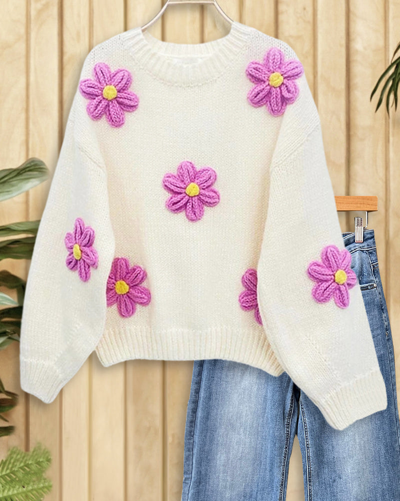 Elegant round-neck sweater with 3D flower decor in hit colors. Perfect for chic layering.