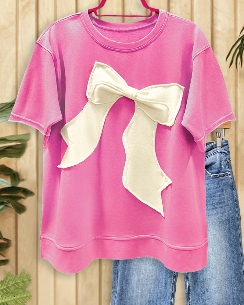 Mint Boutique Hit Color Bow Applique Girly Round Neck T-Shirt