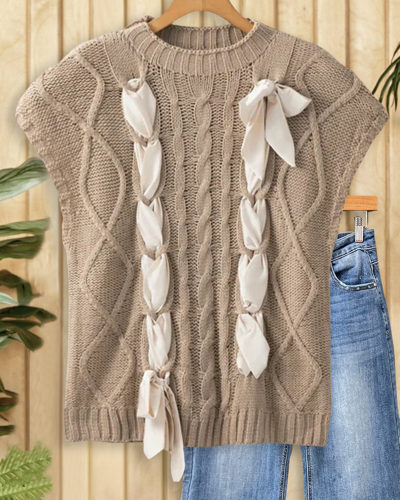 Chic cable knit blouse with hit color and bowknot decor, perfect for cozy stylish days.