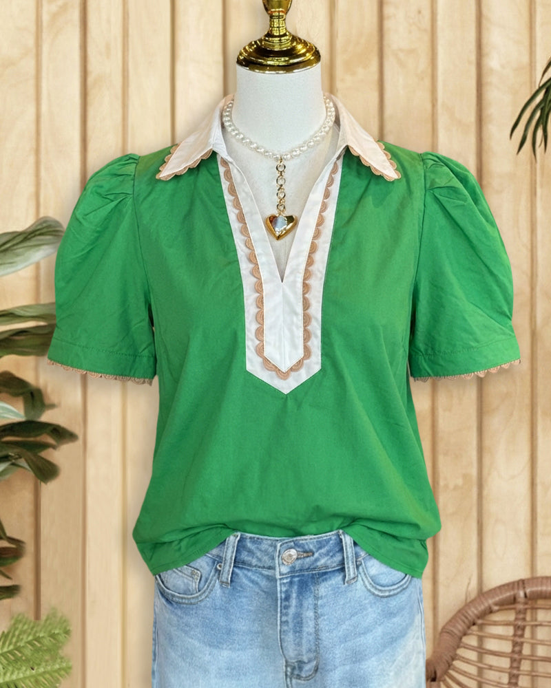 Mint Boutique Hit Color Modern Puff Sleeve Scalloped Trim Blouse