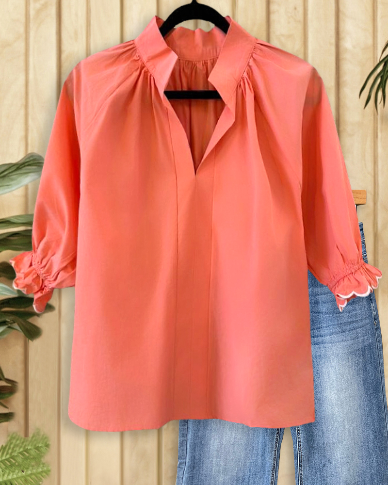 Feminine V-neck blouse with hit color and scalloped trim, perfect for chic outings.