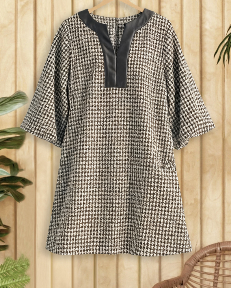 Versatile houndstooth mini dress with split neck, perfect for stylish casual or office wear.
