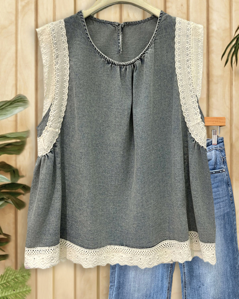 Cute flutter sleeves and lace patchwork add a feminine touch to this denim T-shirt for casual charm.