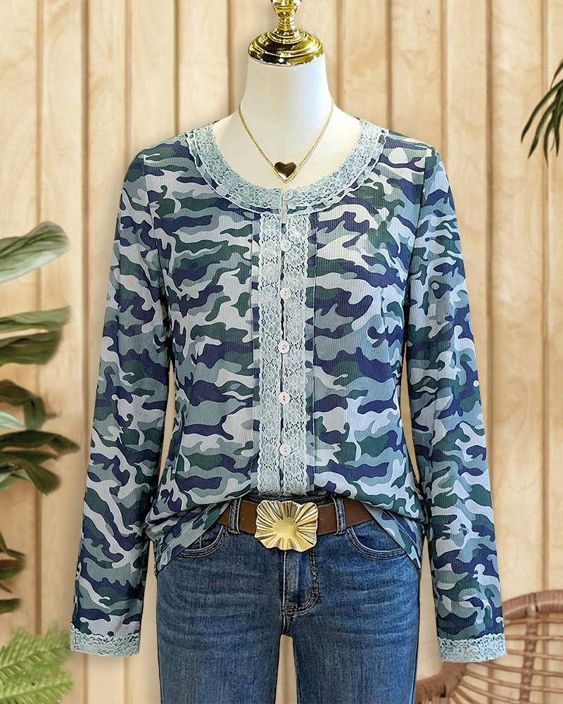 Stylish camouflage button-up blouse with lace trim, perfect for casual outings or chic everyday wear.
