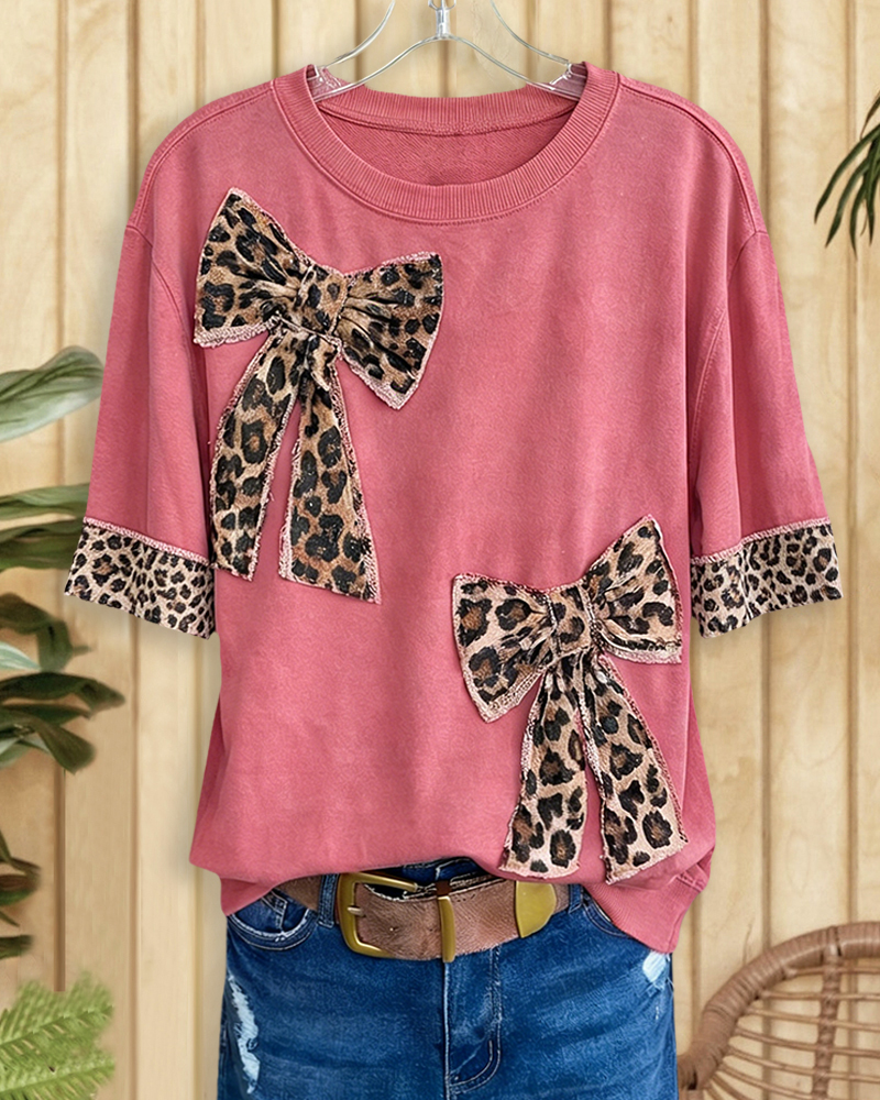 Feminine short sleeve shirt with leopard bowknot applique, perfect for daily wear.