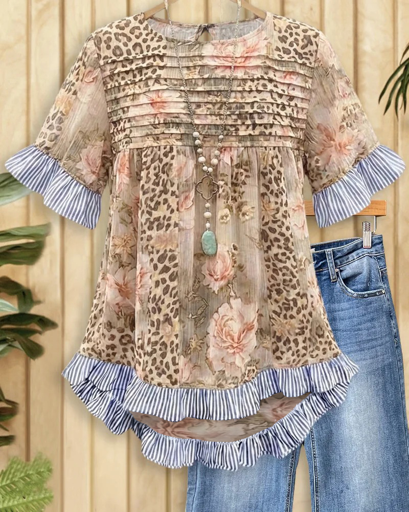 Mint Boutique Leopard & Floral Print Wild Ruffles Trim Babydoll Blouse
