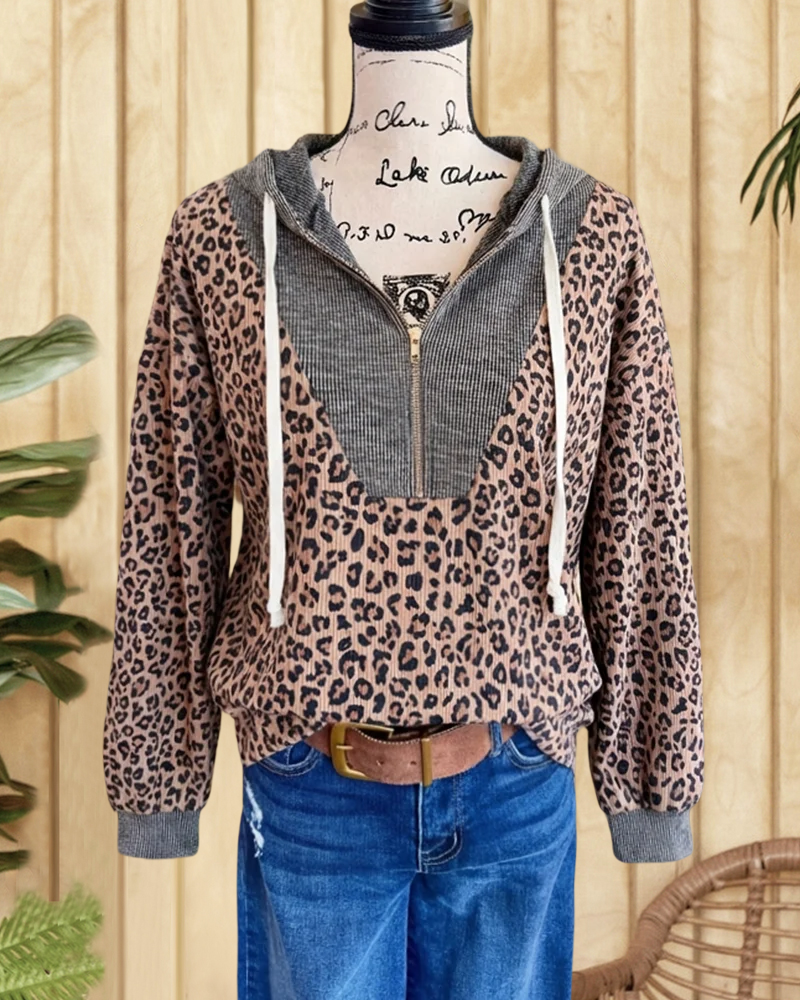 Leopard print hooded shirt with zipped design, perfect for casual everyday wear.