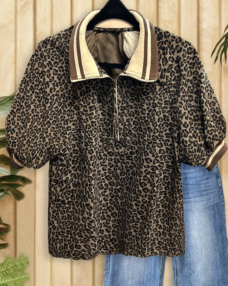 Sporty leopard print shirt with puff sleeves and zipper collar for trendy wear.
