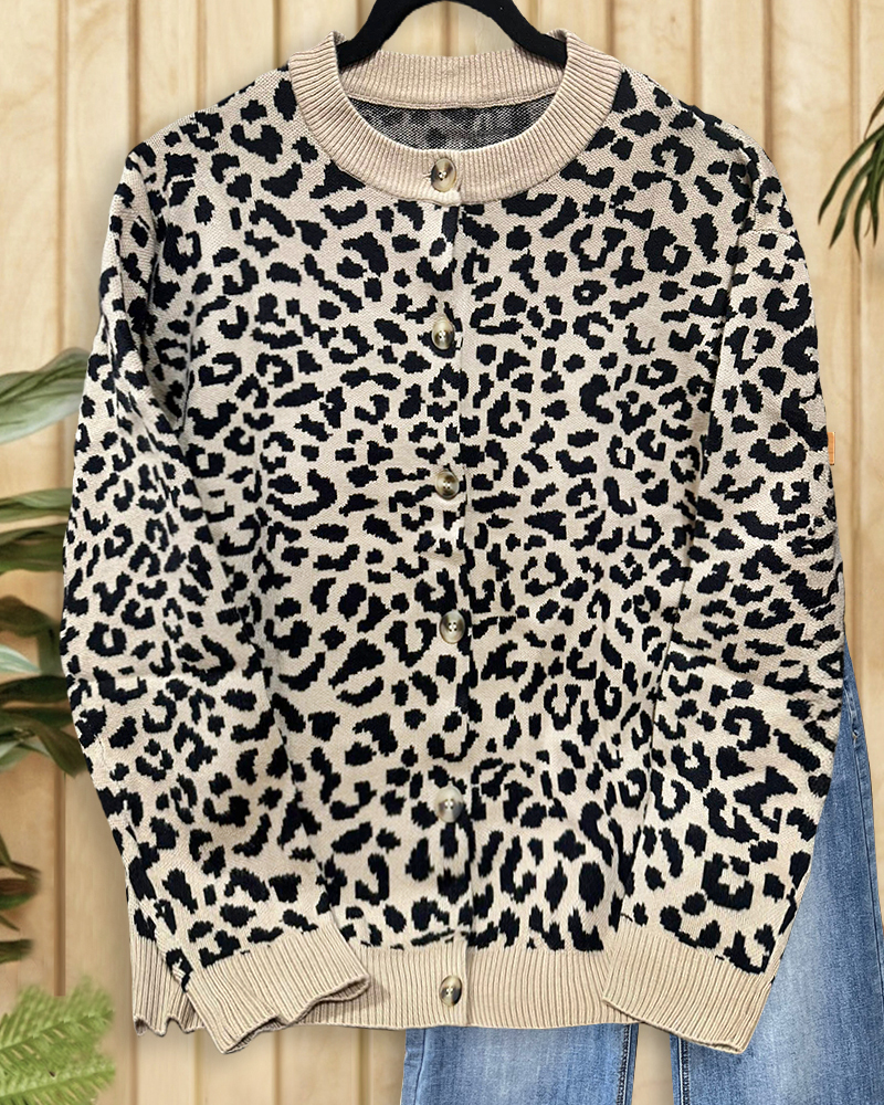 Wild leopard print cardigan with button-up front, perfect for bold and trendy layering.