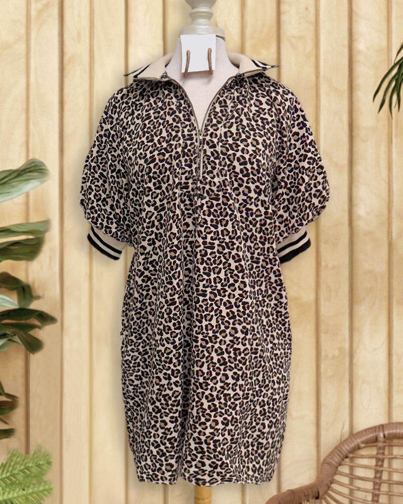 Perfect for casual or edgy looks, featuring leopard print, a zip-up design, and an on-trend mini dress silhouette.