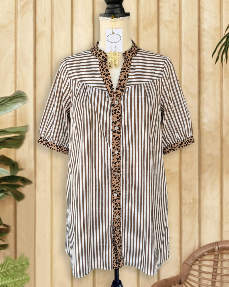 Mint Boutique Leopard Trim Striped Casual Single Breasted Mini Dress