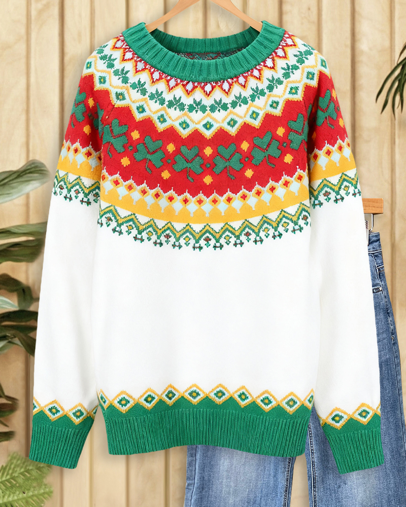 Retro round-neck sweater with mixed floral patterns, perfect for casual vintage style.