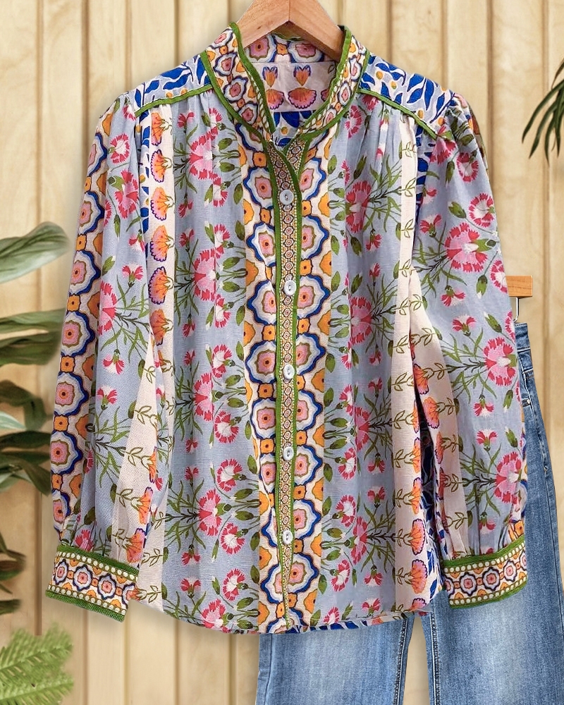 Boho button-up blouse with mixed floral print, perfect for casual outings or layered looks.