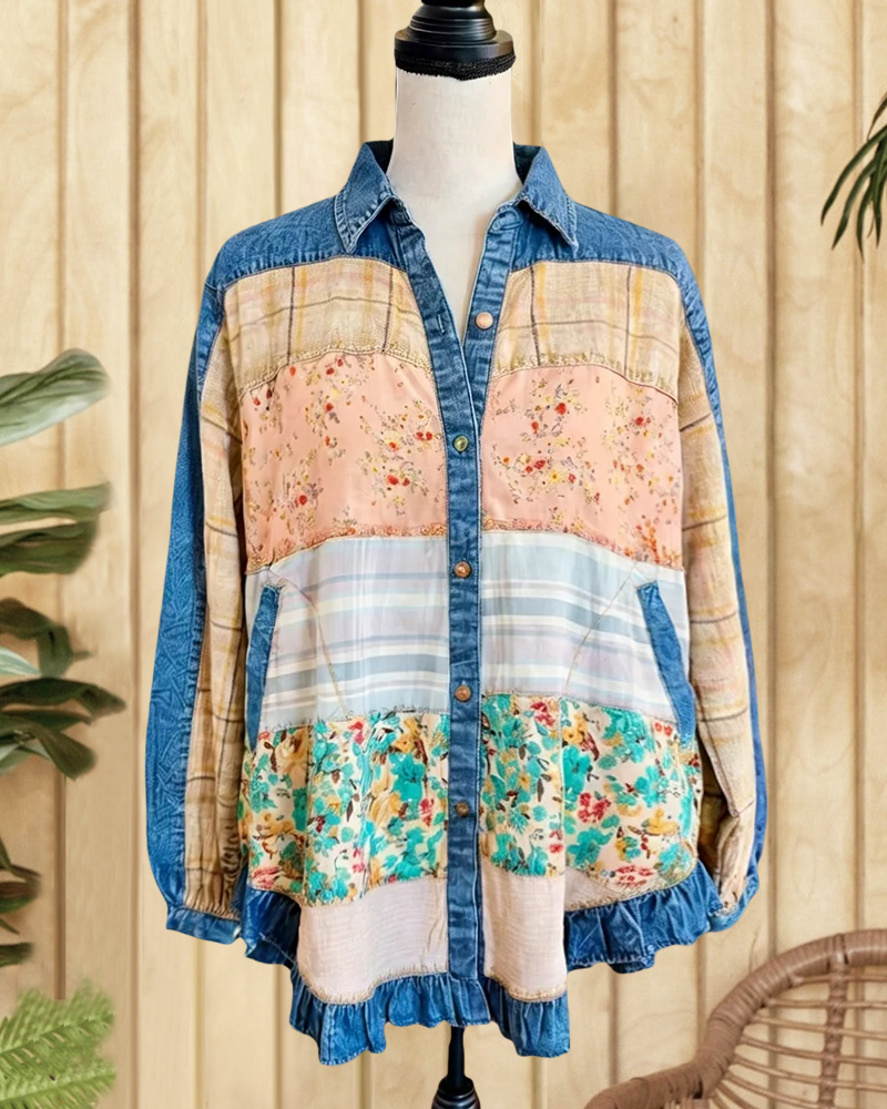Relaxed button-up shirt with mixed patchwork and ruffle details, perfect for casual everyday wear.