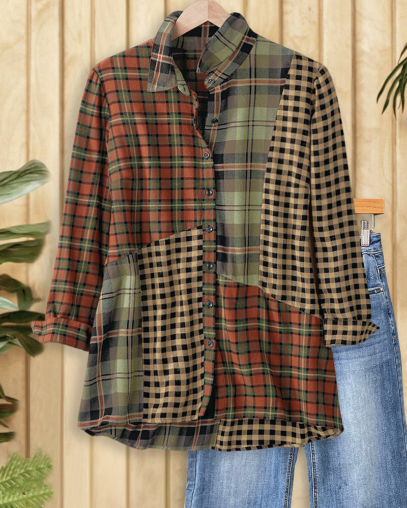 Modern button-down blouse with mixed plaid print, perfect for a stylish everyday look.