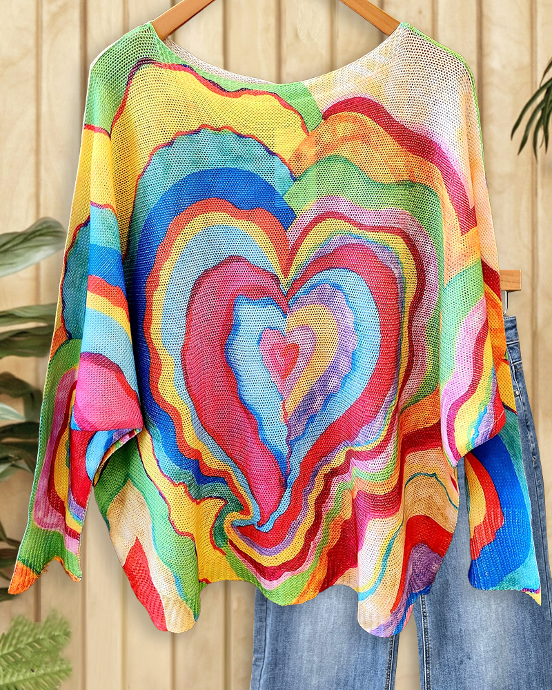 Colorful heart knit blouse with urban charm, cozy for outings and daily wear