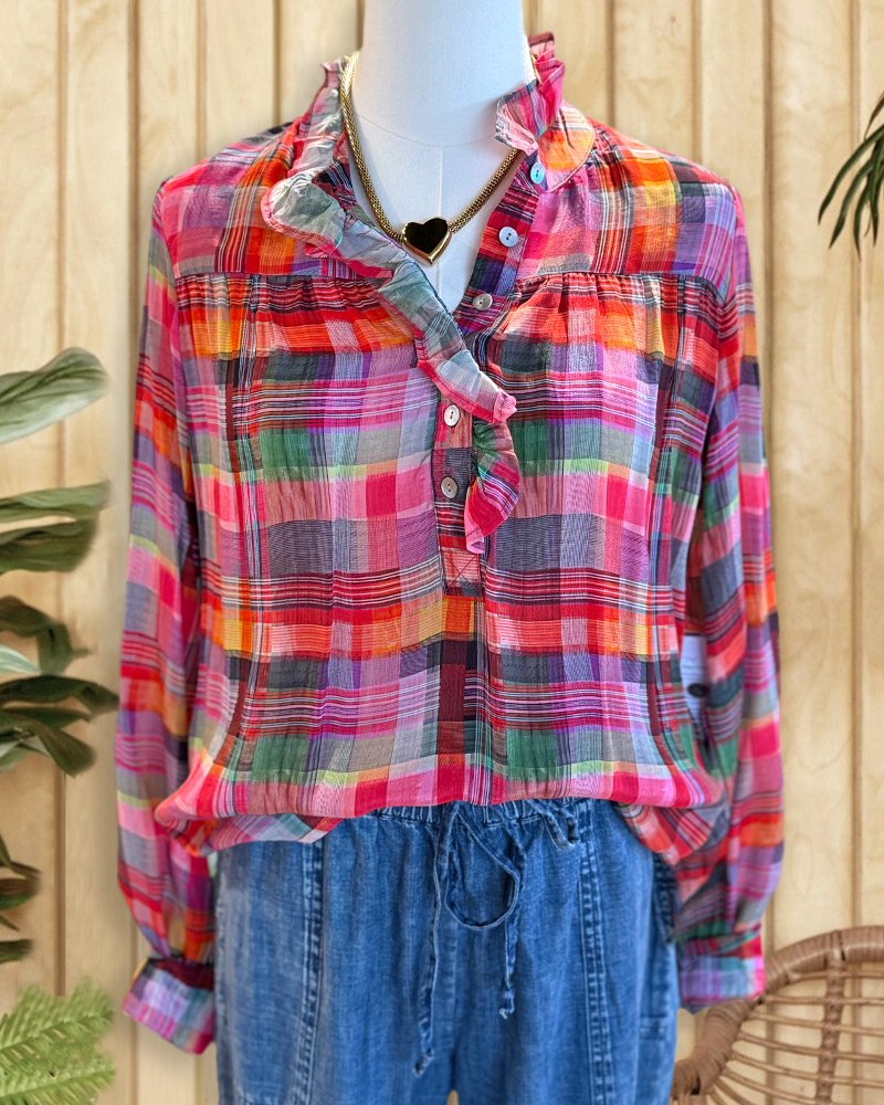 Casual multicolor plaid blouse with ruffle trim, perfect for everyday wear.