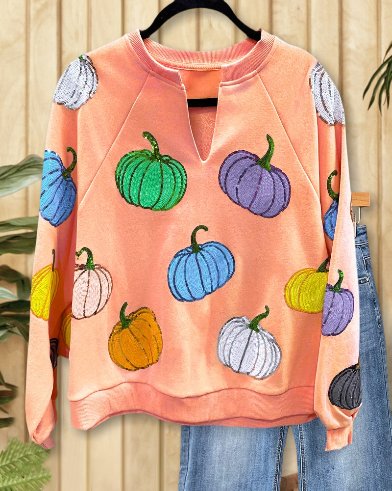 Festive split-neck sweatshirt with multicolor sequined pumpkin, perfect for holiday celebrations and seasonal fun.