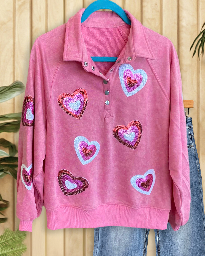 Trendy sweatshirt adorned with sequined hearts, perfect for casual and playful outfits.