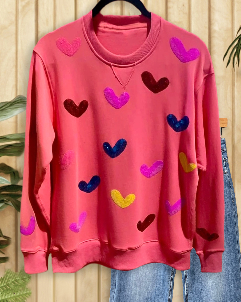 Sweet round-neck sweatshirt with multiple sequined hearts, perfect for cute and playful looks.