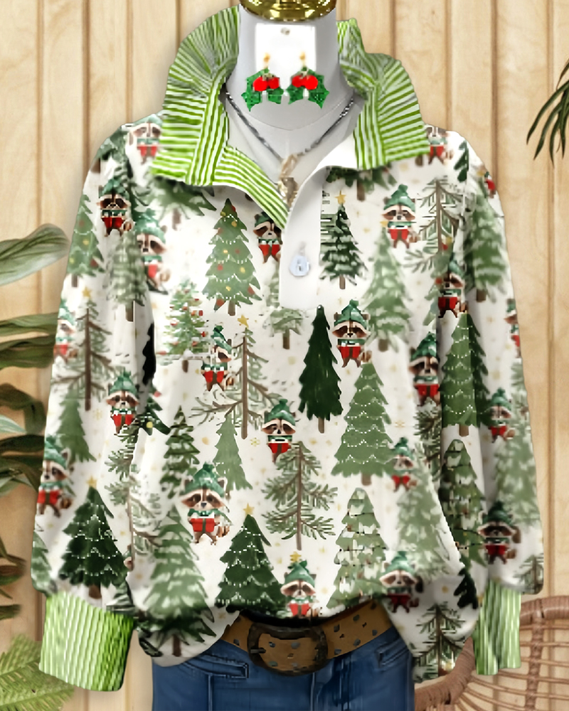 Festive blouse with multiple tree print patchwork, perfect for holiday or casual celebrations.