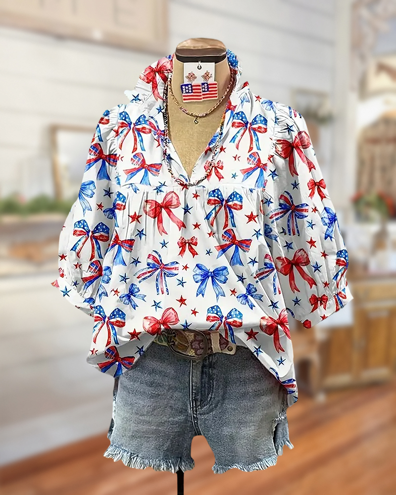 Mint Boutique National Flag-Inspired Bowknot Print V Neck Festive Blouse