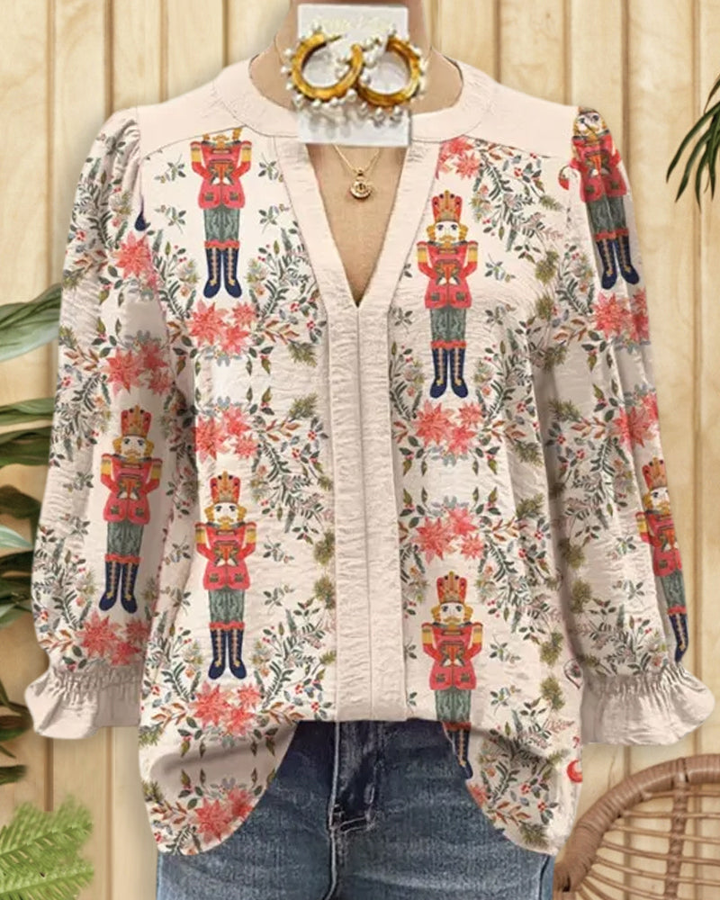 Feminine V-neck blouse with nutcracker print, perfect for festive holiday outfits.