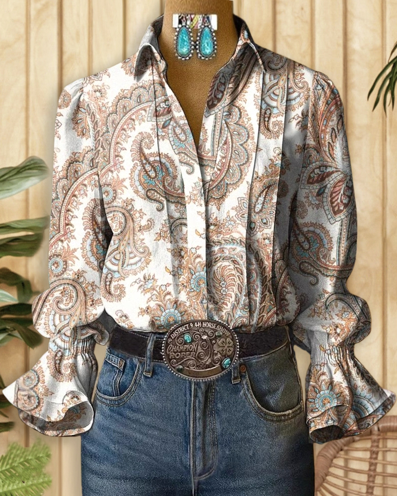 Boho button-up blouse with paisley print and trumpet sleeves, perfect for stylish casual wear.