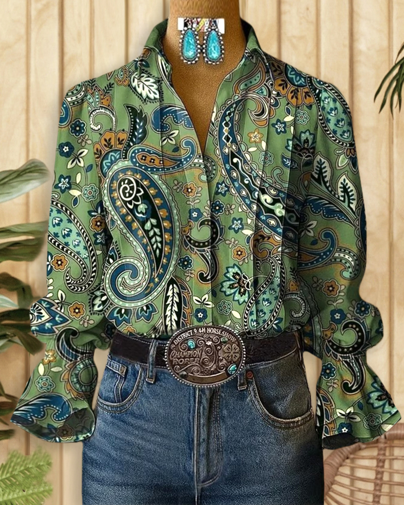 Feminine button-up blouse with paisley print and trumpet sleeves, perfect for chic everyday wear.