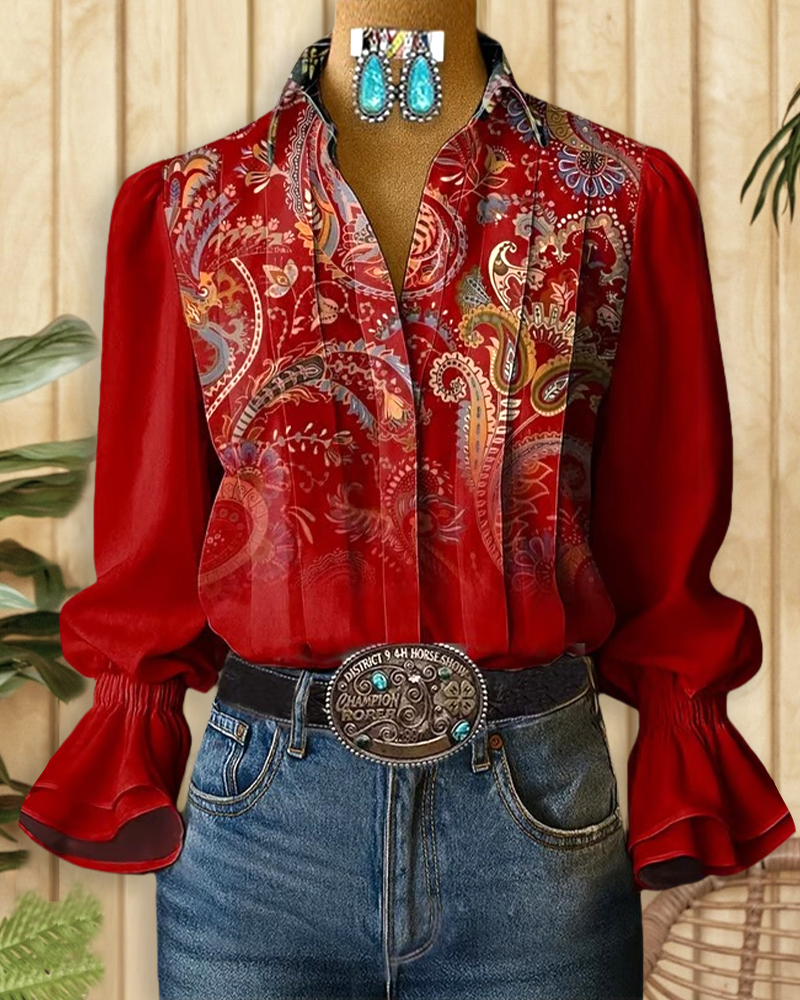 On-trend button-up blouse with paisley print and trumpet sleeves, perfect for stylish casual wear.