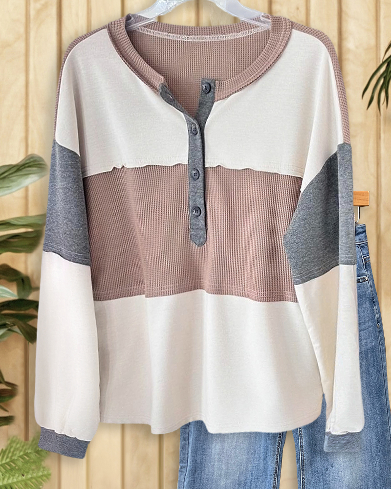 Boyish color block patchwork sweatshirt with round neck, ideal for trendy casual wear.