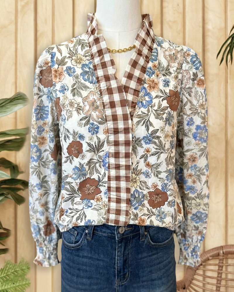 Mint Boutique Patchwork Floral Print Elegant V Neck Blouse