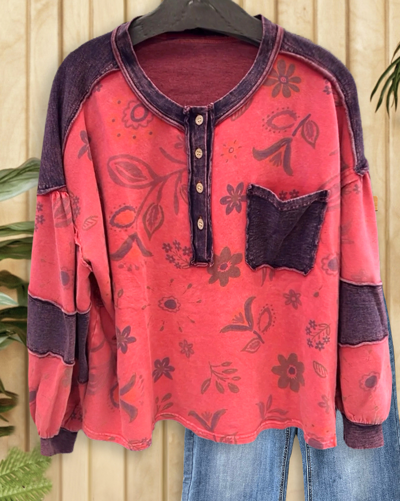Mint Boutique Patchwork Floral Print Relaxed Round Neck Henley Shirt