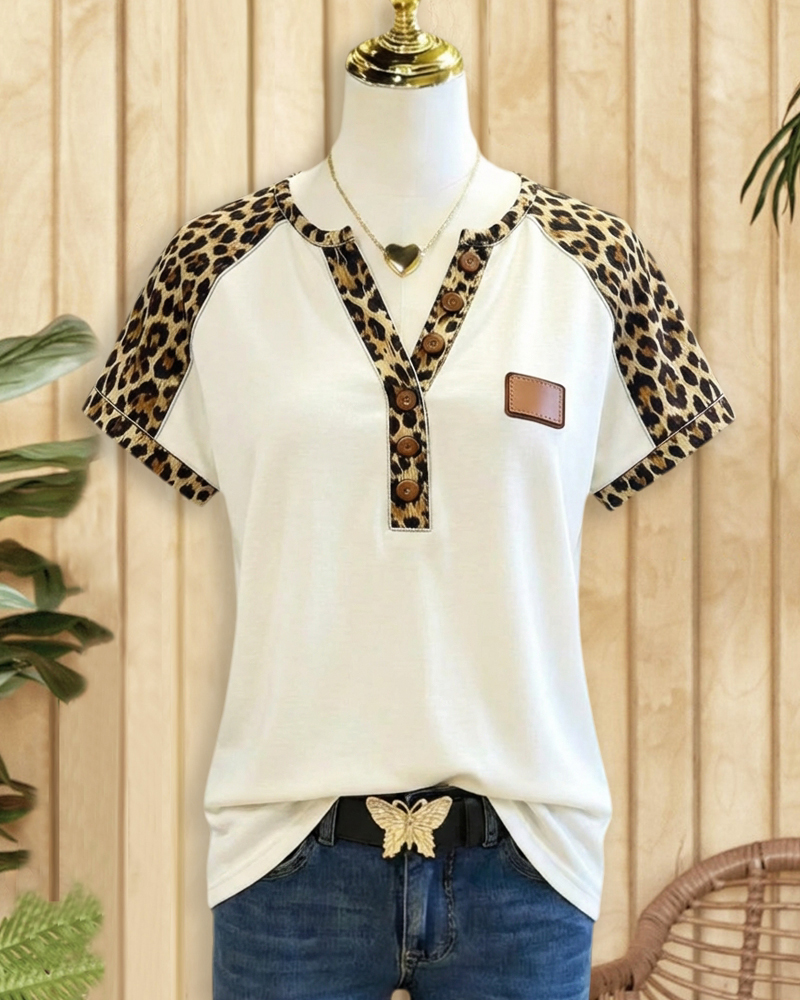 On-trend V-neck shirt with patchwork and leopard print for stylish everyday wear.