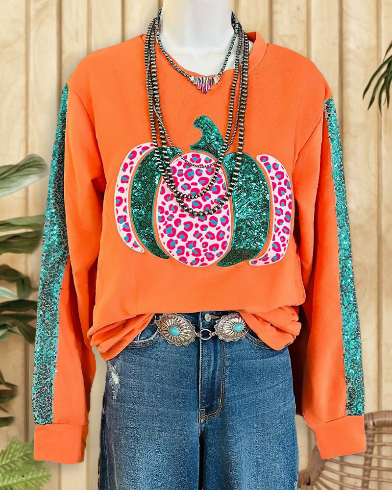 Mint Boutique Patchwork Sequined Glittery Pumpkin Round Neck Sweatshirt