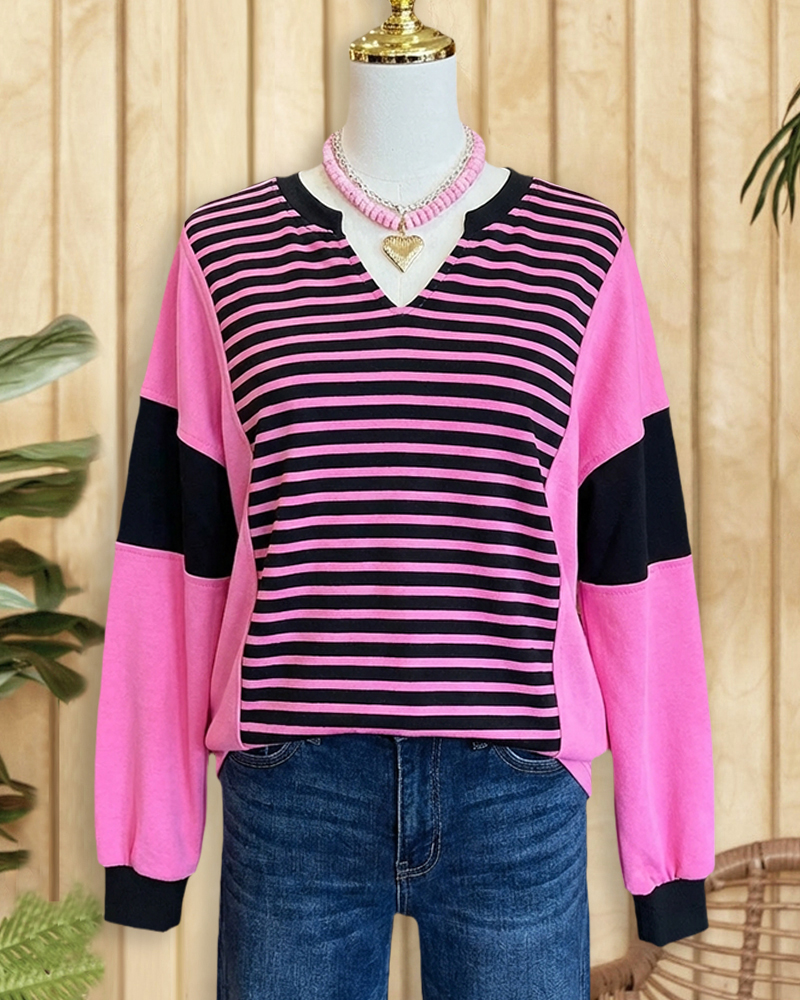 Mint Boutique Patchwork Striped Color Block Cozy V Neck Sweatshirt