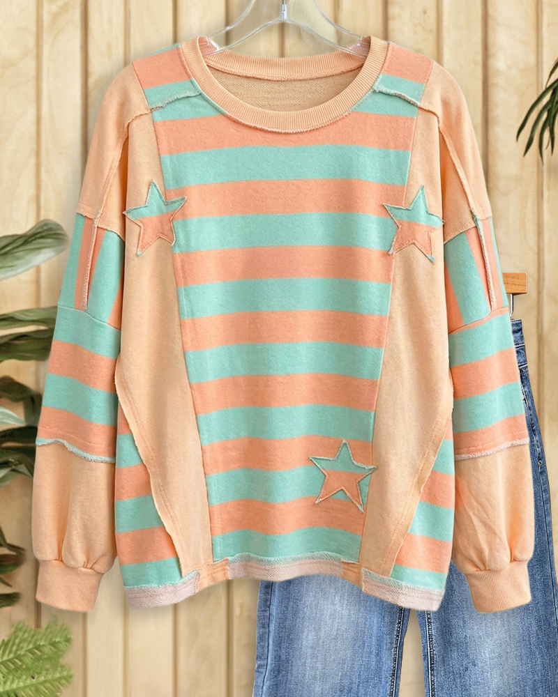 Mint Boutique Patchwork Striped Star Applique Round Neck Urban Sweatshirt